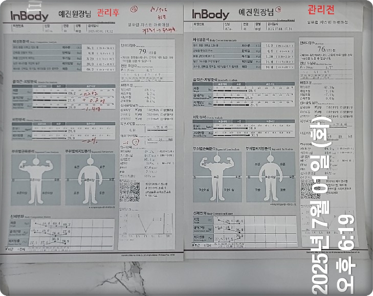 그런데 가장 놀라운 건 바로 InBody 검사 결과였는데요. 30분 관리로 체지방이 빠진다는게 신기 했어요[ 관리 전 체중은 74.2kg, 체지방률 37.1%였는데, 30분 관리 후엔 73.9kg / 36.8%]로 수치 변화가 있었습니다. 단 한 번의 관리로도 이 정도 반응이라니 정말 깜짝 놀랐어요.