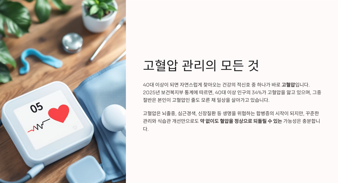 그렇다면 고혈압은 왜 무서운가요? 고혈압은 뇌졸중, 심근경색, 신장질환 등 생명을 위협하는 합병증의 시작이 되기 때문입니다. 하지만 꾸준한 관리와 식습관 개선만으로도 약 없이도 혈압을 정상으로 되돌릴 수 있는 가능성은 충분합니다.