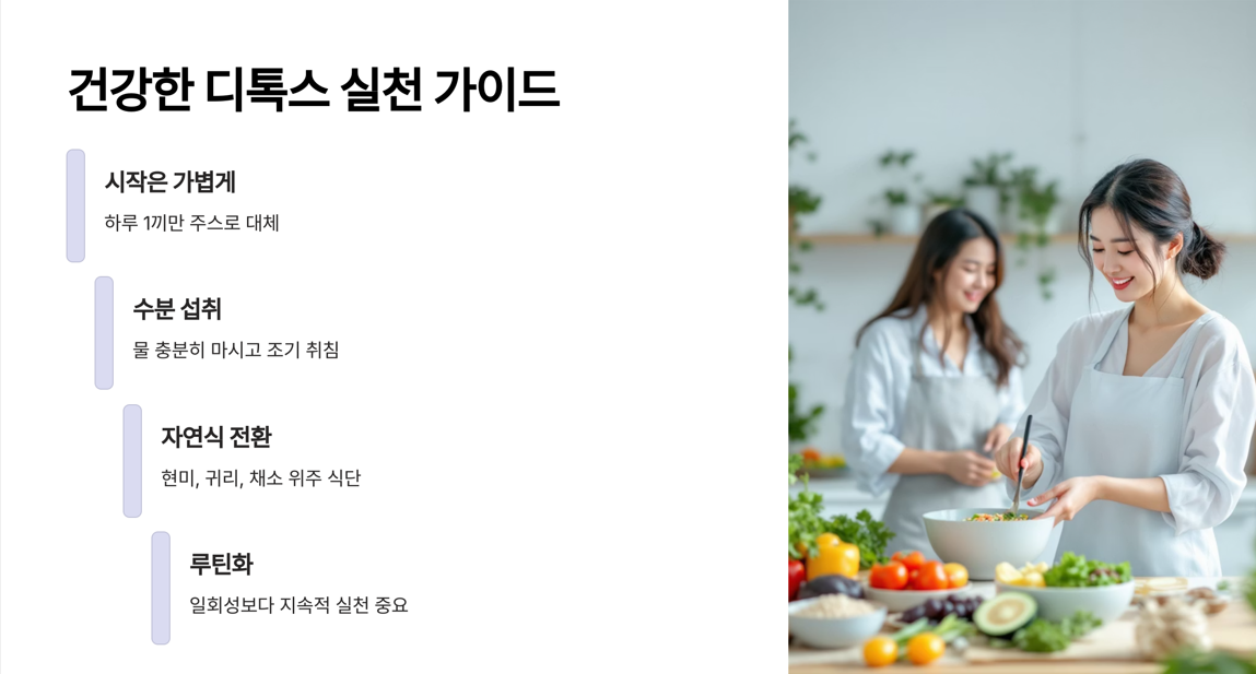 디톡스는 모든 사람에게 적합한 방법은 아닙니다. 특히 갱년기, 저혈당, 만성질환이 있는 분들은 신중해야 해요. 어지럼증, 두통, 무기력 등 증상이 나타날 수 있으며, 장기적인 저열량 식단은 기초대사량을 낮출 수 있습니다. 디톡스를 시도하기 전엔 반드시 내 몸 상태를 체크하고, 가벼운 방법부터 천천히 시작하세요.