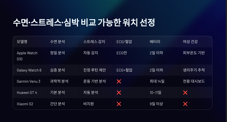 | Apple Watch S10 | ✅ 정밀 분석 | ✅ 자동 감지 | ✅ ECG만 지원 | 🔋 2일 이하 | ✅ 피부온도 기반 |