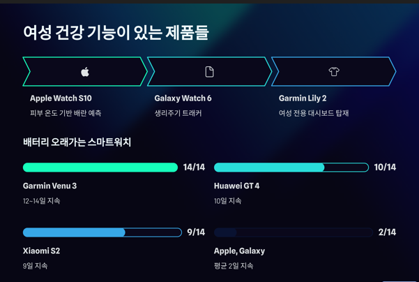 | 모델명 | 수면 분석 | 스트레스 감지 | ECG/혈압 | 배터리 지속시간 | 여성 건강 기능 |