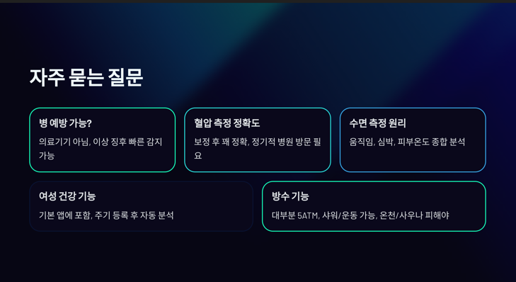 | Galaxy Watch 6 | ✅ 심층 분석 | ✅ 진정 루틴 제안 | ✅ ECG+혈압 | 🔋 2일 이하 | ✅ 생리주기 추적 |